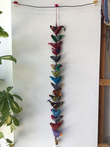 A wonderful hanging decoration from Jaipur in India; a string of 16 colourful fabric birds, connected by beautiful glass beads and finished with a small bell at the bottom.