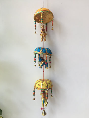 A wonderful hanging decoration from Jaipur in India; a string of 3 colourful fabric elephants each hanging under an umbrella, connected by beautiful glass beads and finished with a small bell at the bottom.