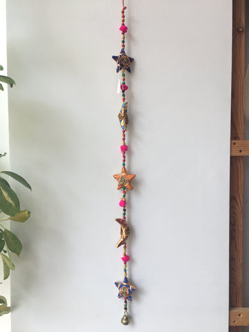 A wonderful hanging decoration from Jaipur in India; a string of 5 colourful fabric Moon & Stars, connected by beautiful glass beads and finished with a small bell at the bottom.
