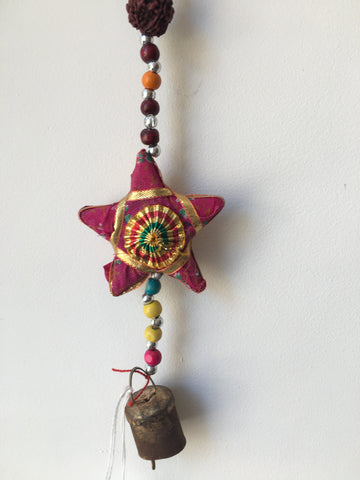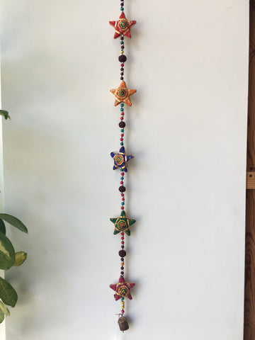 A wonderful hanging decoration from Jaipur in India; a string of 5 colourful stars, connected by beautiful glass beads and finished with a small bell at the bottom.