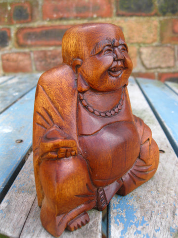 A beautiful hand carved Laughing Wooden Buddha Statue, made from Suar Wood, a sustainable hardwood from Indonesia that is fast growing and easily replaceable.