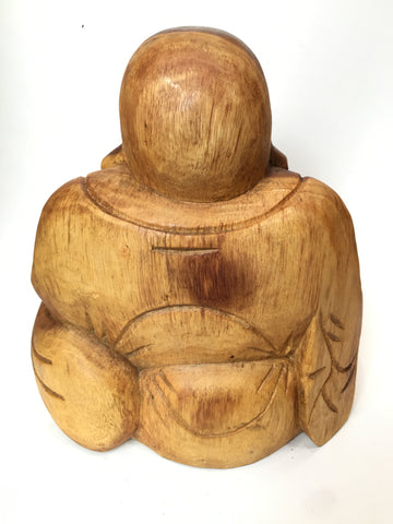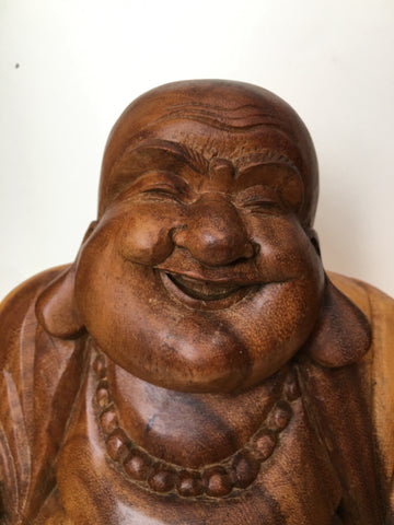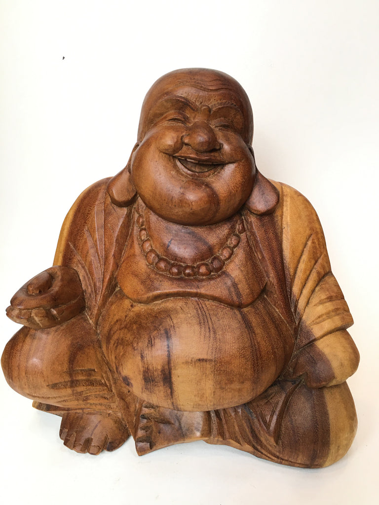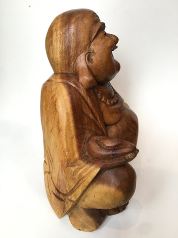 A beautiful hand carved Laughing Wooden Buddha Statue, made from Suar Wood, a sustainable hardwood from Indonesia that is fast growing and easily replaceable.