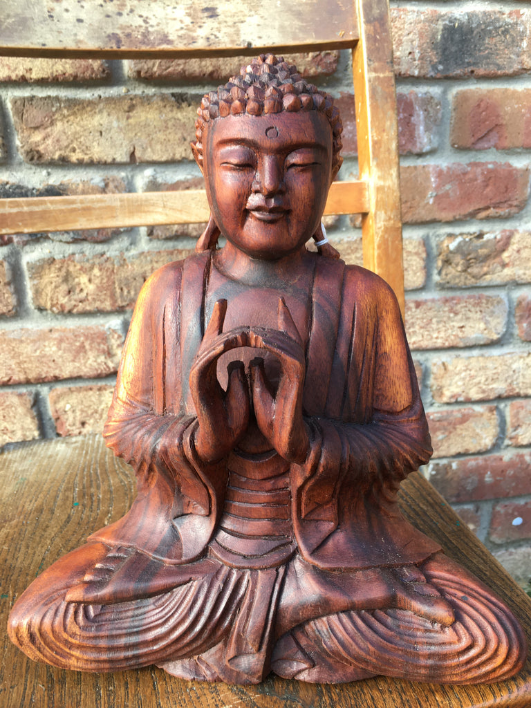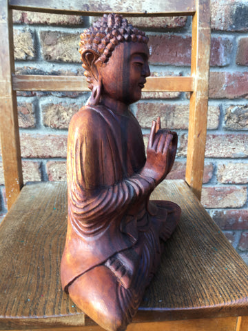 A beautiful hand carved praying Wooden Thai Buddha Statue, made from Suar Wood, a sustainable hardwood from Indonesia that is fast growing and easily replaceable.