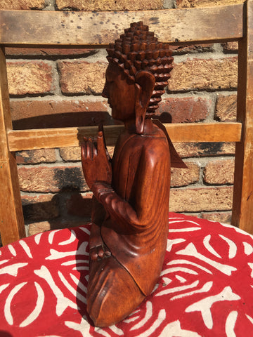 A beautiful hand carved praying Wooden Thai Buddha Statue, made from Suar Wood, a sustainable hardwood from Indonesia that is fast growing and easily replaceable.