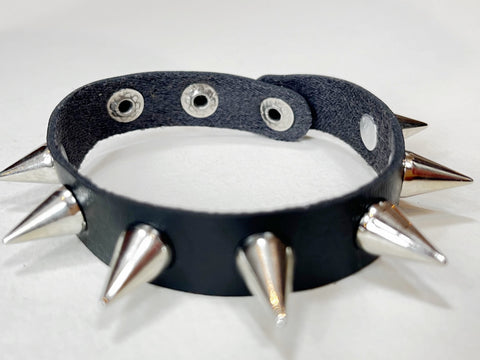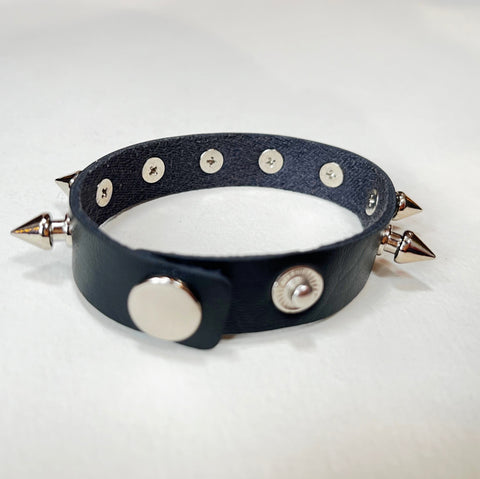 Fantastic studded bracelets made from faux, vegan friendly leather! Available in 2 spike sizes and each one has a metal clasp closure to snap them them shut!
