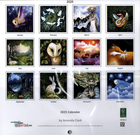 A stunning 2025 Wall Calendar by acclaimed artist Amanda Clark! Each month has a beautiful painting by Amanda Clark with the days of the month & the phases of the moon all marked on so you'll never miss anything!
