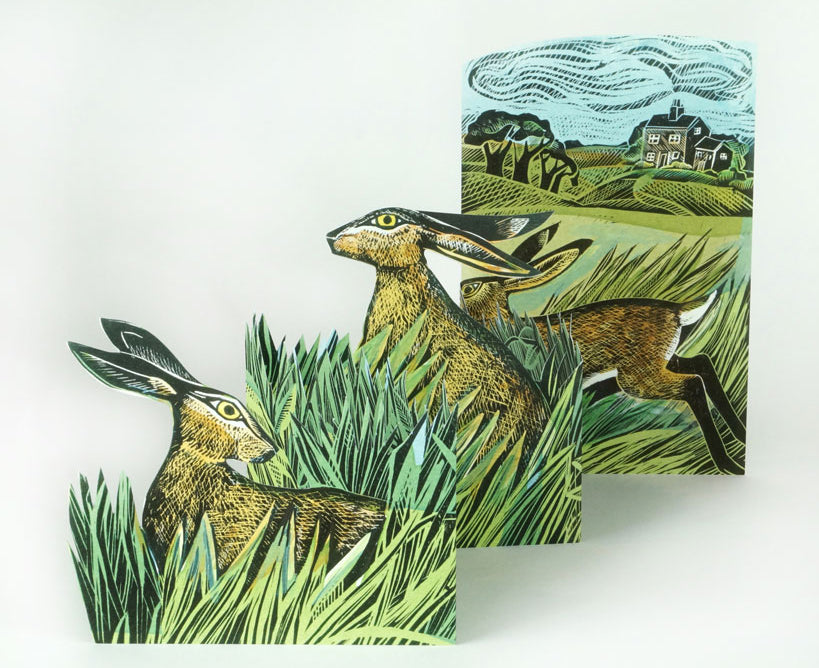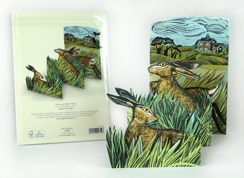ANGELA HARDING 3D DIE CUT GREETING CARD Hares & Open Fields