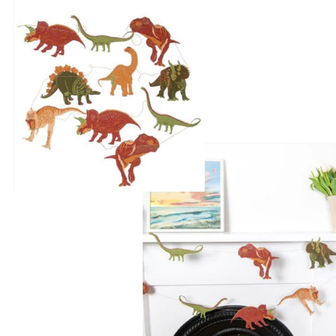 From Tyrannosaurus to Triceratops, this garland has ten prehistoric dinosaurs spread across Three Metres! The garland is printed on both sides on thick, hand made cotton paper. The shapes are sewn in a random order along strong cotton thread, with hanging loops either end, meaning you can hang your garland straight away!