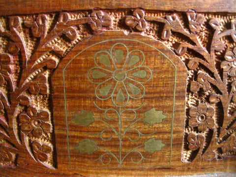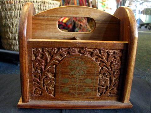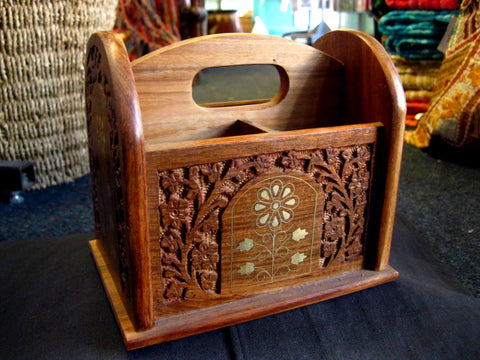 A beautiful Wooden Letter Holder with a wonderful hand carved leaf motif that decorates the outside of the letter holder and frames, like crawling ivy the elegant Brass Inlay flower design that adorns the front, back and sides of this fantastic Wooden Letter Holder.