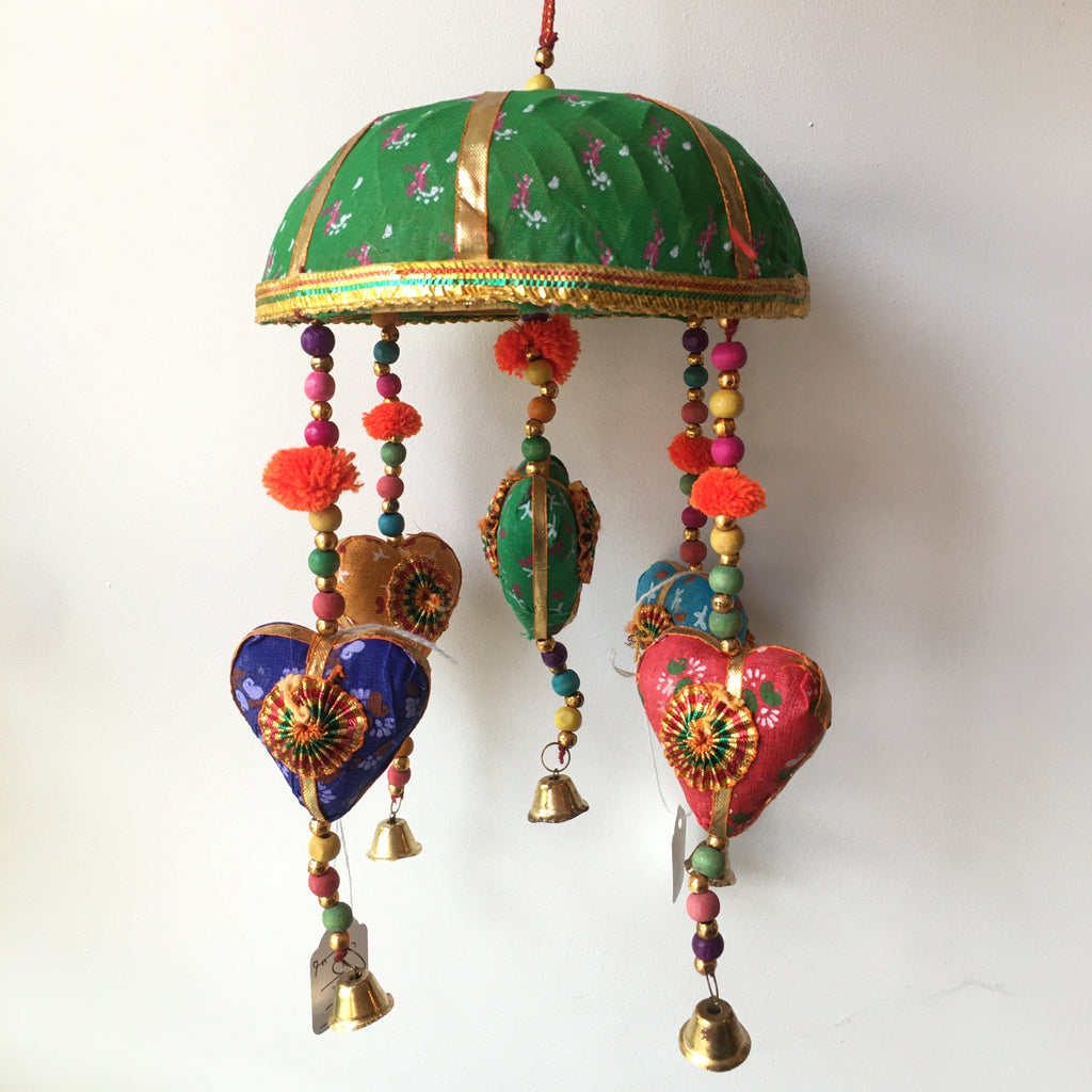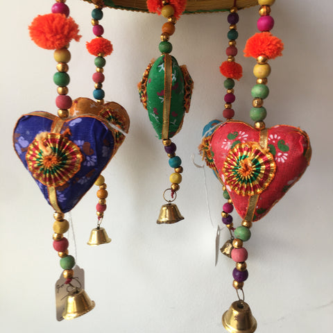 A wonderful hanging decoration from Jaipur in India; 5 Hearts dangle from a brightly coloured umbrella attached by beads and glass with bells hanging from the hearts!