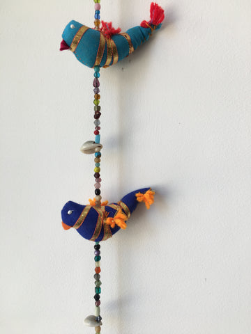 A wonderful hanging decoration from Jaipur in India; a string of 20 colourful birds, connected by beautiful glass beads and finished with a small bell at the bottom.