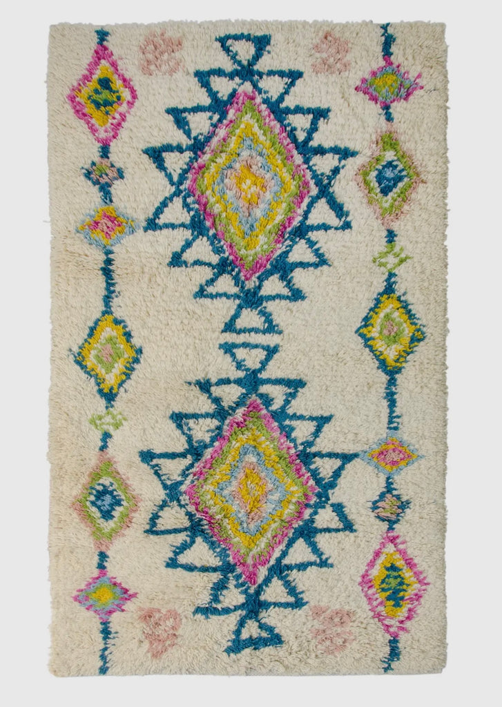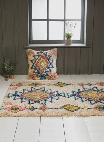 Hand made in India using traditional techniques, this Fair  shaggy rug is a great way of brightening up your floors. Made using wool and cotton, the simple but effective colourful geometric pattern on this rug contrasts wonderfully with the deep shaggy cream pile. This rug is sure to add contemporary warmth to your living space.