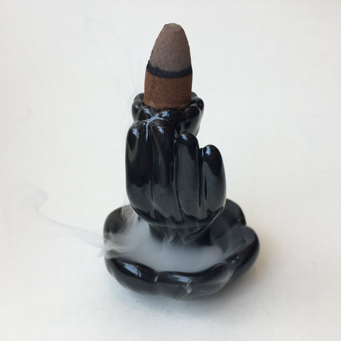 A stunning Backflow incense cone holder/burner in a beautiful hand & Lotus design! The smoke from the backflow incense (also available on our website!)cascades down the stem and hand and pools in mystical swirls at the bottom of the holder!