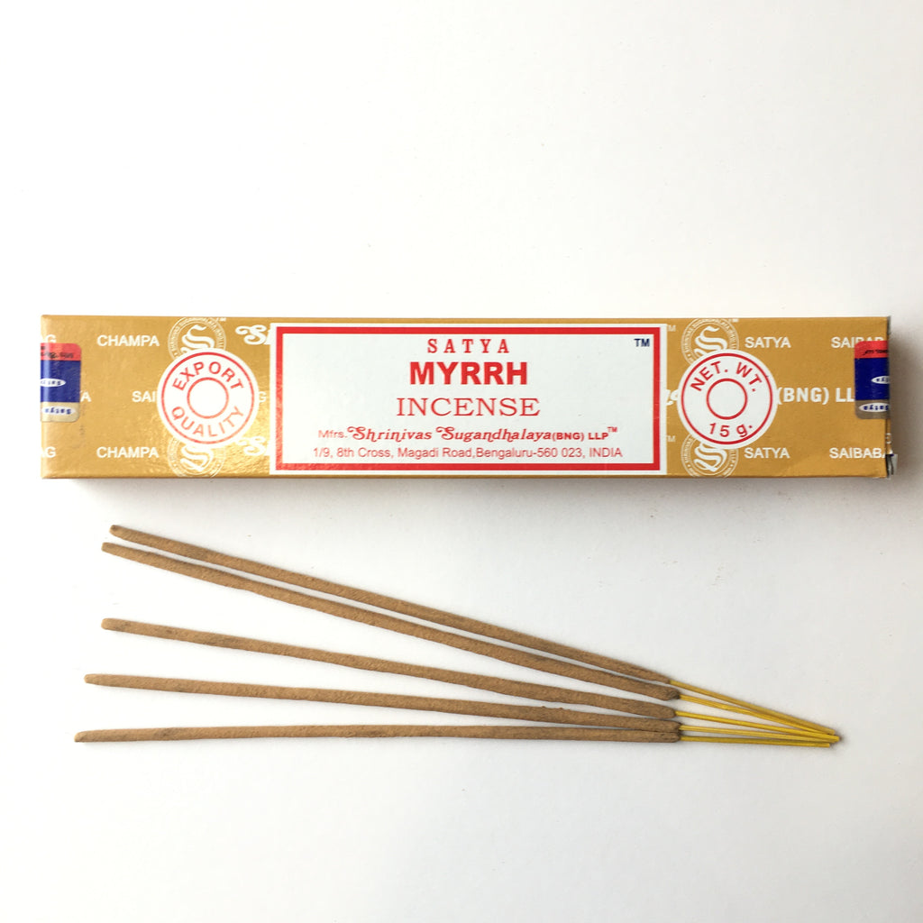 Satya Myrrh is derived from the gummy sap of the Boswellia and Commiphora trees. An ancient aroma, Satya Myyrh is a purifying incense that has a sweet, earthy scent that reminds me of black liquorice a little!