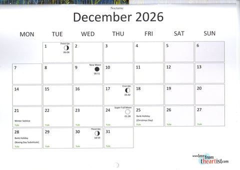 A stunning 2026 Wall Calendar by acclaimed artist Hannah Willow! Each month has a beautiful painting by Hannah Willow with the days of the month & the phases of the moon all marked on so you'll never miss anything!
